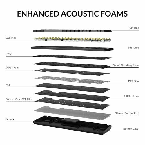 Includes IXPE acoustic foam, EPDM foam, steel plate, and stabilizers for improved typing feel and sound.