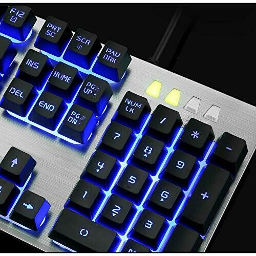 - The keyboard features a metal brushed panel for increased weight, durability, and easy cleaning. - Seven adjustable backlight colors with modes including breathing, always-on, and off, plus four brightness levels. - Keycaps use a two-color injection molding process to improve light transmission and durability, preventing paint wear. - Ergonomic design with multiple keycap curves to better fit the hand during use. - Antighosting full-key conflict-free design ensures simultaneous key presses are registered instantly without conflicts.