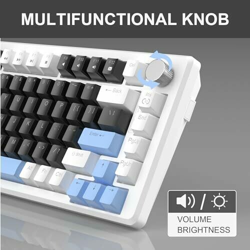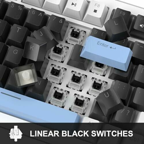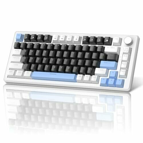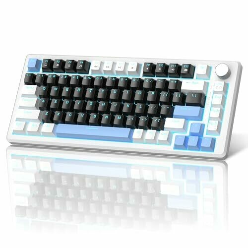 • Ergonomic design with EVA foam dampening and layered construction for quieter typing, plus a stylish black/white keycap aesthetic with blue DIY accents.