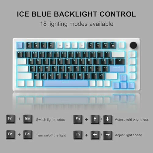 The STAR75 keyboard features a 75% compact layout with 83 keys and a wired USB connection for reliable, low-latency input. It offers ice-blue backlighting with 18 modes, 5 brightness levels, and 4 speed levels, which can be turned on or off. It uses linear Black switches with an estimated 50 million keystroke lifespan, 100% anti-ghosting, and fast, precise keystrokes suitable for gaming. A 2-in-1 multifunctional knob controls audio or backlight settings, with a mode indicator to switch between functions. The keyboard includes EVA foam and a double-layer sound-dampening construction to reduce noise, and the keycap set is black and white with an additional 16 blue keycaps provided for customization. The product is marketed as portable NKRO capable PC gaming hardware.