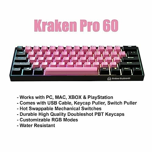 The Kraken Pro 60% mechanical keyboard is designed for PC, Xbox, PlayStation, and Mac compatibility. It ships with a braided USB cable, keycap puller, switch puller, Kraken sticker, extra switches, and an instruction manual. It uses hot-swappable mechanical switches, allowing interchangeability with any compatible switches. The keyboard features silver speed switches and fully customizable RGB lighting. It has a black and pink housing and a compact 60% form factor. It is described as water resistant.