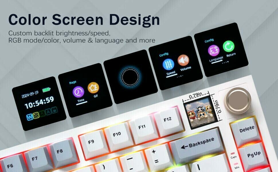 HUO JI 75% Wireless Keyboard with TFT screen. Connection options include Bluetooth 5.1, 2.4 GHz wireless, and USB‑C wired. Works with multiple devices and platforms via tri‑mode connectivity. Battery