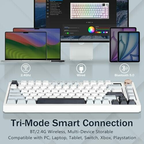 • Tri‑mode versatility: Bluetooth 5.1, 2.4G wireless, and USB‑C wired, letting you switch between up to five devices with ease.