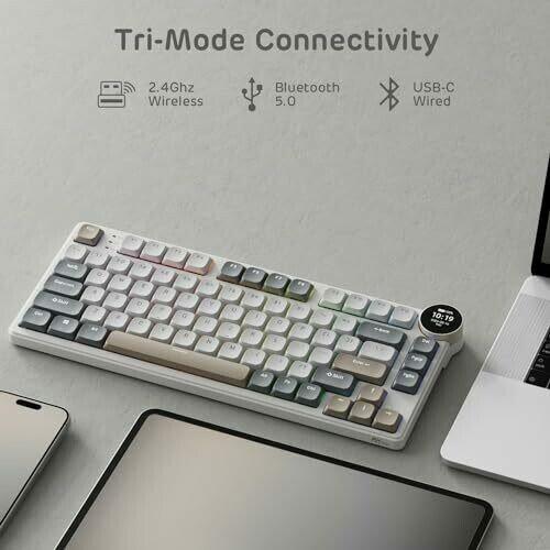 Compact screen and knob control display custom GIFs, dates, connection modes, WIN/MAC layouts, and battery status. Controls include volume, connection modes, backlit brightness and speed, and RGB modes/colors via knob or click. Tri-mode connectivity includes Bluetooth 5.0, 2.4 GHz wireless, and USB-C wired mode. Low-profile custom switches feature shorter actuation distance for faster response. Top-mounted design provides firm keystroke and typing feedback. Structure includes dual-layer sound-absorbing foams and a silicone bottom dampening pad to minimize noise.