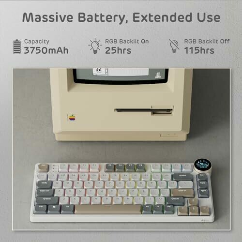 Slim 75% keyboard with a smart display screen and a responsive knob for quick control. Switch between bluetooth, 2.4G, and USB-C wired modes for seamless multi-device use. Long-lasting battery powers all-day work and play with quiet linear red switches.