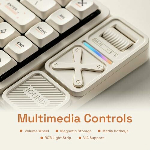 A side panel provides a volume wheel, four media keys, and a RGB strip, with a hidden magnetic compartment for the 2.4 GHz dongle; VIA software enables per-key remapping and macro creation without extra apps.