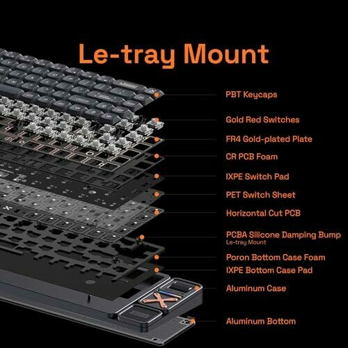 The keyboard uses a Le-tray mount, FR4 plate, and a six-layer foam stack to reduce fatigue and minimize noise for a comfortable typing experience.