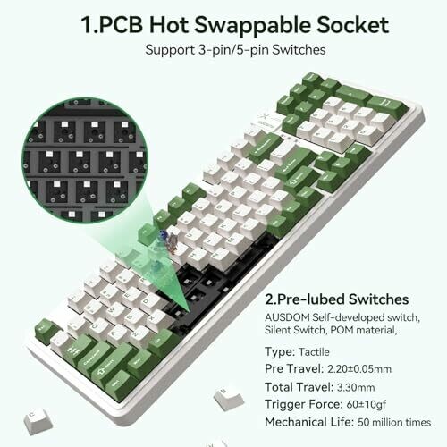 • Silent tactile typing powered by AUSDOM's pre-lubed switches for a distraction-free workspace.