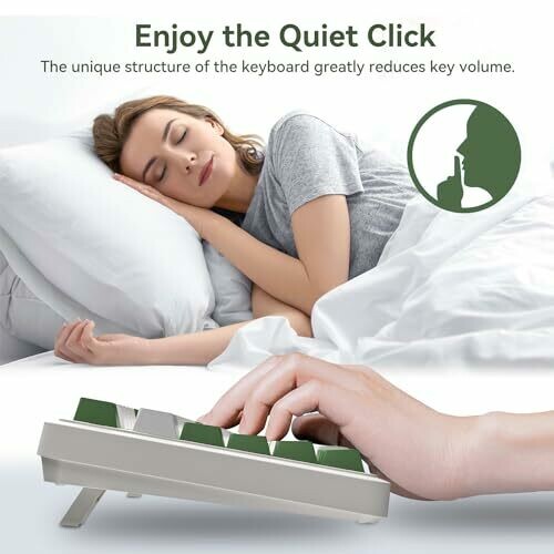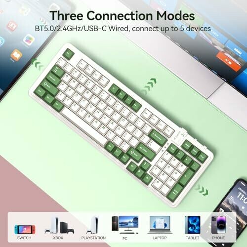 Silent tactile typing with pre-lubed switches provides a distraction-free workspace. Tri-mode connectivity covers Bluetooth, 2.4 GHz, and Type-C wired. Gasket-structure with a compact 97-key layout, backlight, two-stage feet, and two-color PBT keycaps for durable comfort.