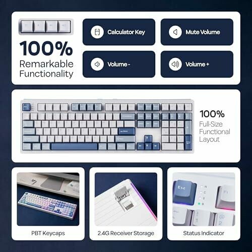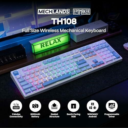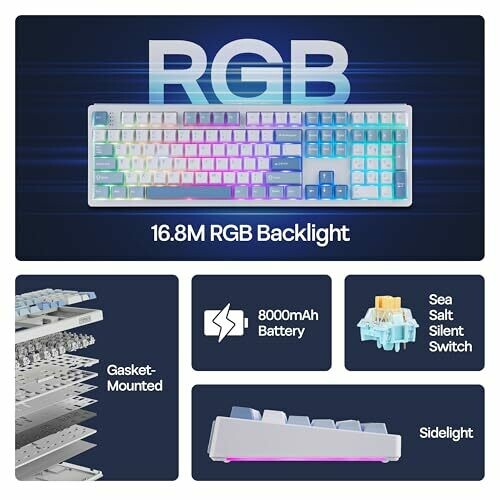 The product features a full 108-key layout with double-shot PBT keycaps and a solid chassis weighing over 1.2 kg. It includes an 8000 mAh battery and supports wired, 2.4 GHz wireless, and Bluetooth connections for multi-device use, with up to 160 hours of battery life in wireless mode. The keyboard employs a 5-layer gasket-mount design to improve acoustics and dampen vibrations. It is hot-swappable for 5-pin mechanical switches, and can be driven by a dedicated driver for customization of layout, macros, backlight, and sensitivity. It offers RGB backlighting with blue and white color schemes and supports several switch options, including Creamy Jade and Sea Salt Silent switches, factory-lubed for immediate use. The device supports full compatibility with PCs, Mac laptops, Android tablets, and gaming consoles, and delivers precise input timing with low latency in wired mode and a 1 kHz polling rate in wireless mode.