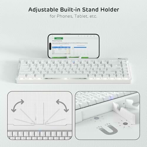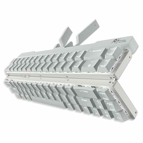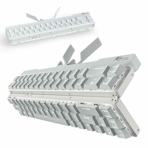 A portable foldable 60 percent mechanical keyboard with an a reinforced aluminum body, built-in stand holder, and low-profile tactile brown switches. It supports wireless and wired use with Bluetooth multi-device connectivity, plus white backlit keys for a clean white aesthetic.