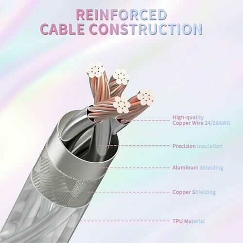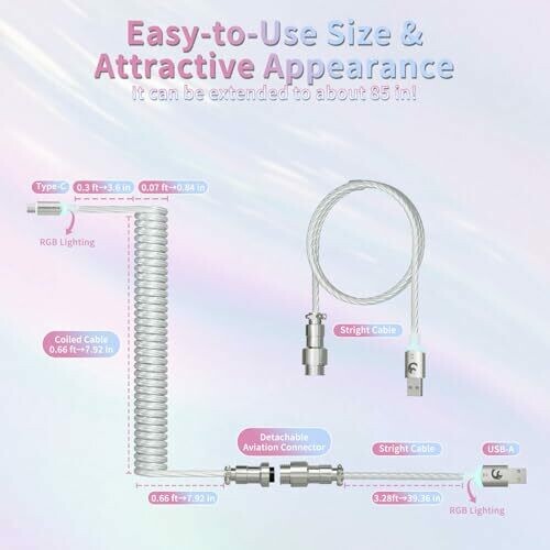 The product is a coiled USB-C keyboard cable with a double-sleeved TPU jacket and 24K gold-plated connectors to ensure stable data transfer and charging, compatible with USB-C to USB-A devices. It features RGB lighting for dynamic effects and an aluminum shielding with copper cores to maintain signal integrity. A detachable aviator connector allows quick cable swaps and modularity across most mechanical keyboards. The cable uses a reversed spring USB-C coil design to resist tangling and knots, with a total length of 4.9 feet (1.62 feet coil plus 3.28 feet straight). It has reinforced joints and TPU materials for long-lasting reliability, and provides high-speed data transfer and charging while minimizing interference with foil shielding.