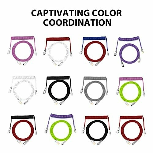 USB 2.0 compliant; double-shielded construction; 61-gauge, 4-conductor configuration; detachable aviator port to accommodate different connectors; includes a USB-C connector cable for modern boards; TPU outer jacket with durable sleeve materials; available in multiple color options to match keyboard aesthetics.