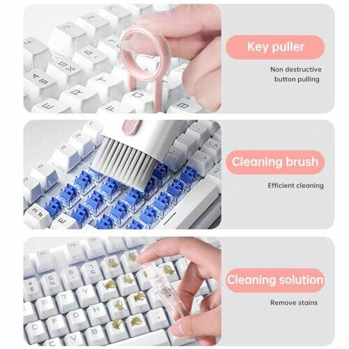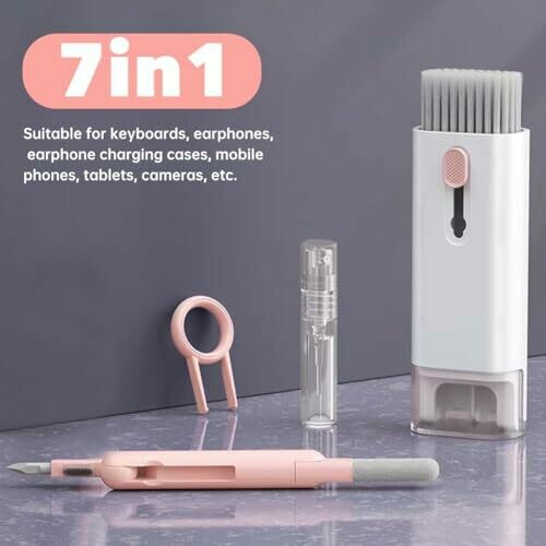 A 7-in-1 electronics cleaning kit designed for keyboards, screens, laptops, and more. It features soft bristles and a flocked sponge to remove dust without scratches, plus a keycap puller, screen wiper, brush set, and cleaning fluid for versatile, portable maintenance.