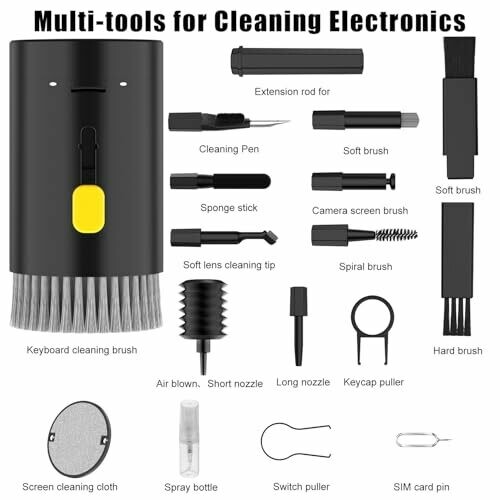 The product is a multifunction cleaning kit intended for electronic devices, including a cleaning pen with metal tip, sponge brush, mini soft brush, round brush, keyboard brush, keycap puller, switch puller, spray bottle, fiber fleece swipe, air blower with long and short nozzles, lens cleaning pen with soft pad, hard bristled brush, soft-bristled brush, and a card remover.