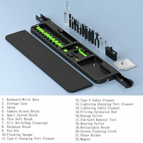 Yakiter multifunctional cleaner kit with keyboard wrist rest and charging port cleaner. Compact design with built-in wrist support and magnetic cover keeps your desk tidy. Includes tools for keyboards, screens, ports and more in a single device, with ergonomic comfort for extended use.