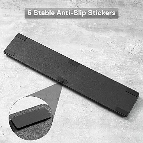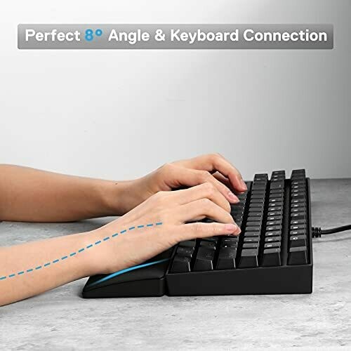 Ergonomic memory foam wrist support cushions during long typing sessions. Soft faux leather surface for comfortable touch and easy cleaning. Anti-slip rubber base keeps it in place. Compatible with 60% to 104-key layouts, low-profile height with an 8° tilt.