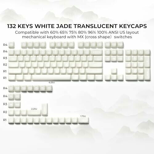 Premium White Jade translucent keycaps with double shot PBT provide durable legends for a minimalist look. MDA profile offers a sculpted, comfortable typing experience across a 132-key set, compatible with ANSI and regional layouts, designed for long-lasting performance on mechanical keyboards.