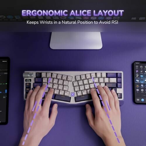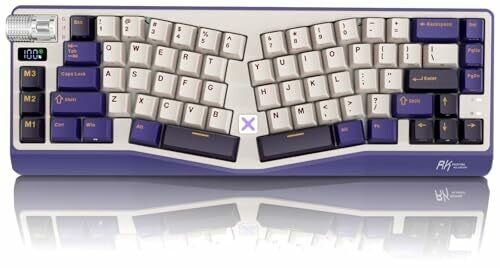 Ergonomic Alice split design reduces wrist strain during long sessions. Tri-mode connectivity includes USB-C wired, Bluetooth, and 2.4 GHz wireless. 65% layout with a built-in volume knob and gasket mounting with pre-lubed linear switches and PBT keycaps. Includes macro keys.