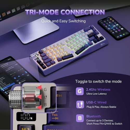 • Tri-mode connectivity: USB-C wired, Bluetooth, and 2.4GHz wireless