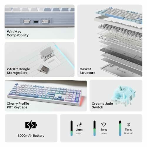 8000 mAh capacity; tri-mode wireless operation (2.4 GHz, Bluetooth, and USB-C wired).