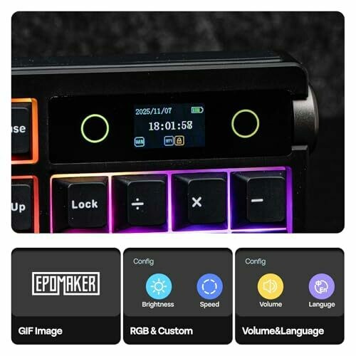 • Full-size mechanical keyboard with a smart display and a volume knob for quick on-device controls.
