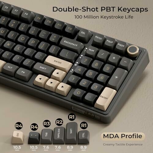 Compact 98-key layout with a built-in numpad, gasket-mounted construction for a cushioned typing feel, pre-lubed Cream linear switches for smooth keystrokes, MDA profile PBT keycaps, and a detachable volume knob for a clean desk setup.