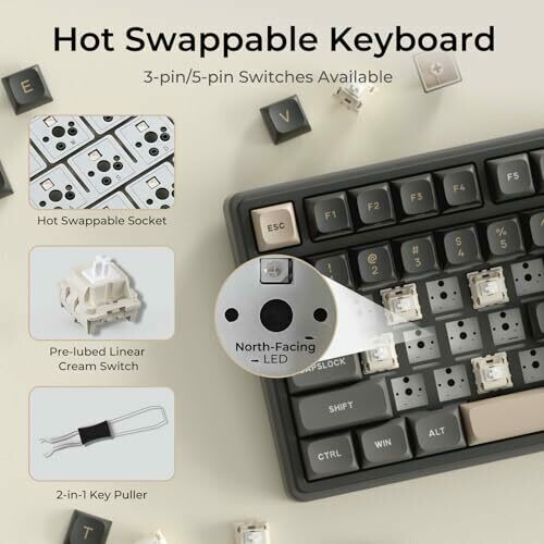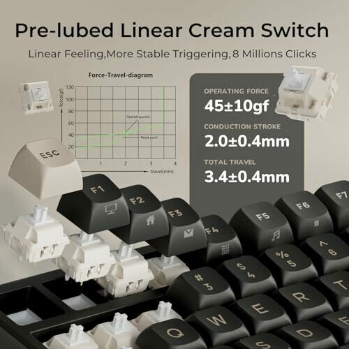 • Pre‑lubed Cream linear switches provide smooth keystrokes with a creamy, consistent sound.