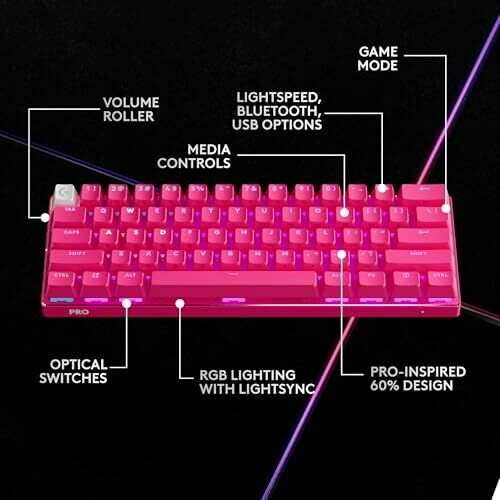 Logitech G PRO X 60 Ultra-compact TKL Mechanical Keyboard for Windows PC with Magenta Dual-Shot PBT keycaps and GX Optical Tactile switches. Includes media controls and game mode for versatile control, delivering a compact, premium typing experience.