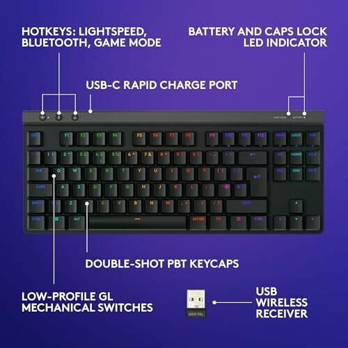 • GL mechanical switches combined with double-shot PBT keycaps provide durable, crisp key action and long-lasting legends.