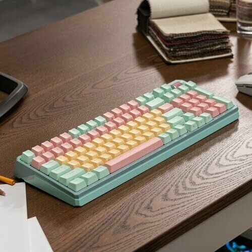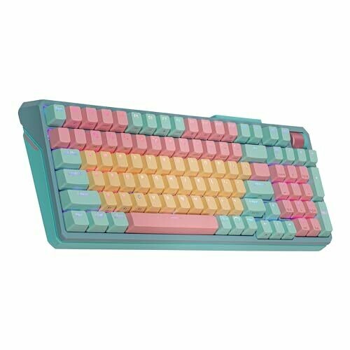 MK770 Macaron Hybrid Wireless Keyboard with a 98-key layout featuring a Numpad for full-size functionality while saving desk space. Hot-swappable Kailh Box V2 Linear Red switches allow user replacement without soldering. Wired USB Type-C and wireless options include 2.4 GHz dongle connectivity and Bluetooth 5.1 for versatile coupling. Gasket-mounted construction with silicone dampers and EVA materials reduces keystroke vibration and noise, delivering quiet operation.