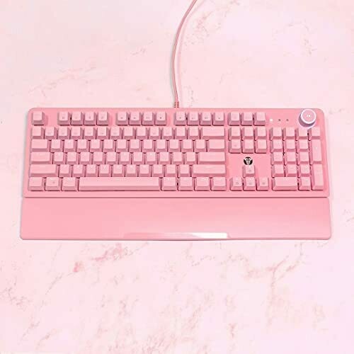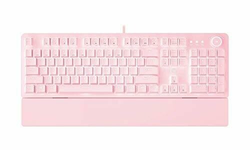 The device uses mechanical blue switches providing tactile feedback and an audible click at the actuation point. It features white LED backlighting for improved visibility in low-light environments. The keyboard includes an ergonomic, detachable wrist rest pad. It has a 104-key layout with anti-ghosting to ensure simultaneous key registration. A multi-function scroll wheel is included for light and volume adjustments. It is compatible with Windows 10, Windows 8, Windows 7, Windows Vista, Windows XP, and Mac OS. The connection type is USB wired.