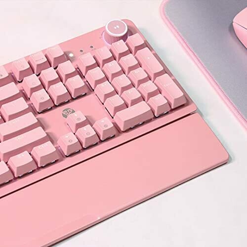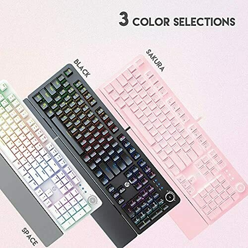 • 104-key mechanical keyboard featuring blue clicky switches for tactile feedback and an audible click on actuation.