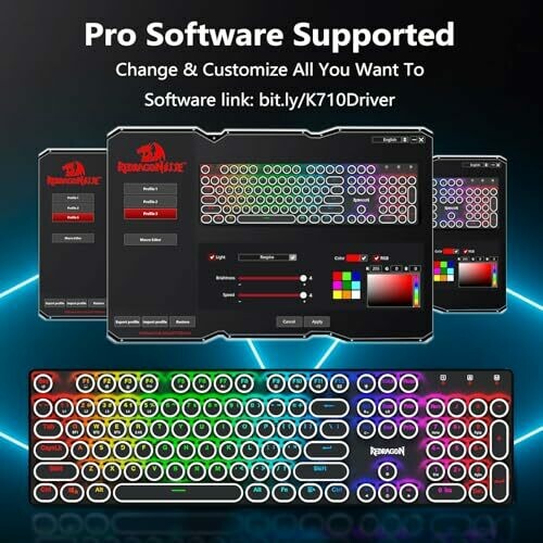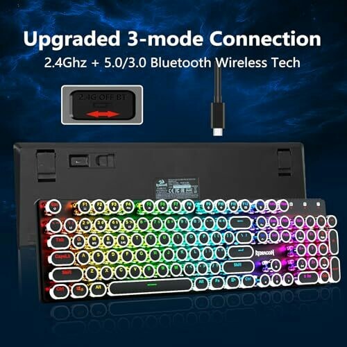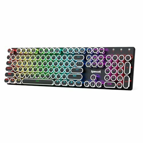 Redragon K710 is a retro typewriter-style keyboard with round keycaps and a metal panel. It offers three connection options: Bluetooth, 2.4GHz, and USB-C wired. Blue switches provide audible click and tactile feedback. Durable metal chassis creates a compact, elegant desk presence.