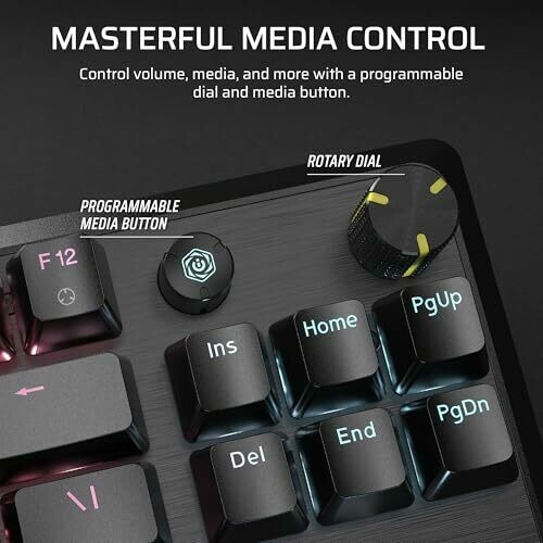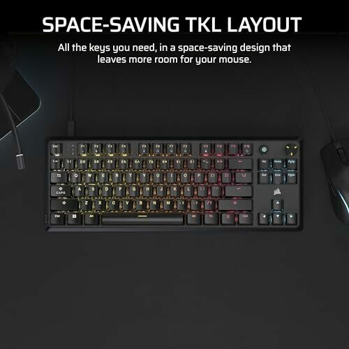 Space-saving tenkeyless layout. Pre-lubed CORSAIR MLX Red v2 linear switches. Per-key RGB backlighting. Two foam sound-dampening layers with pre-lubricated stabilisers. Multi-function rotary dial and programmable media button. ABS double-shot keycaps for durability.