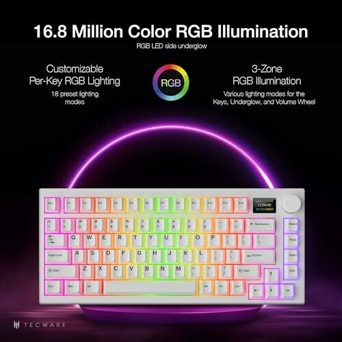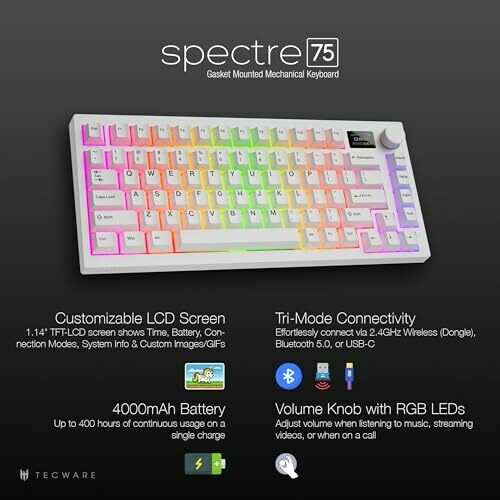 75% mechanical keyboard with gasket mount construction, featuring a 1.14" TFT-LCD LCD screen, and south-facing 5-pin universal hot-swappable sockets compatible with MX-style switches; hot-swappable sockets allow easy switch replacement without soldering. 16.8 million RGB illumination with per-key customization and side underglow. Tri-mode connectivity:
