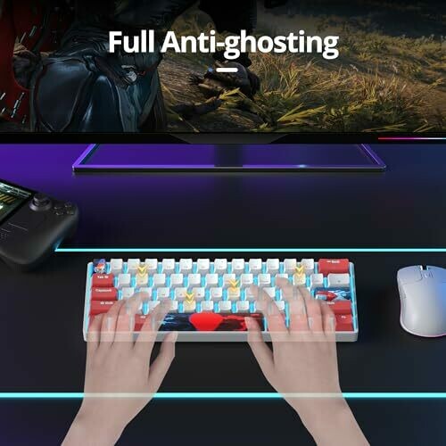 Ultra-compact 60% layout frees up desk space while preserving full functionality with FN key combinations. Smooth linear Red switches offer quiet, precise keystrokes. Ice Blue LED backlight, double-shot PBT keycaps, and full key anti-ghosting ensure reliable inputs on PC and Mac.