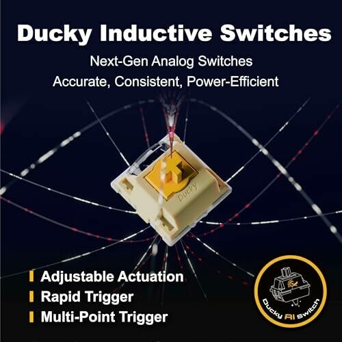 Next-generation inductive analog switches offer improved accuracy, consistency, and power efficiency compared to traditional analog switches. The QUACK Mechanics+ design employs seven-layer dampening within a gasket-mount framework to enhance typing feel and acoustics. Tri-mode connectivity supports USB wired, 2.4 GHz RF wireless, and Bluetooth. The keyboard uses 85% high-purity PBT doubleshot keycaps with resistance to shine. A web-based configuration interface provides easy setup and per-key adjustments without consuming noticeable system resources.