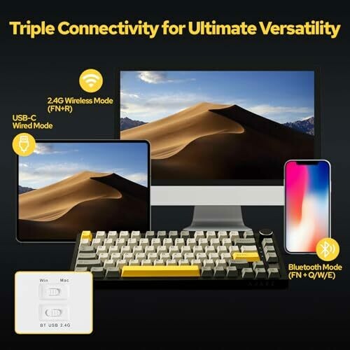 • Three-mode connectivity (BT, 2.4G wireless, and Type-C wired) for seamless multitasking across devices.